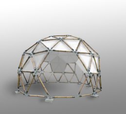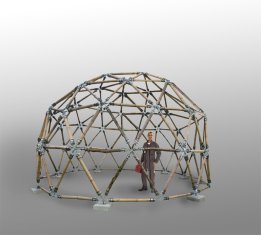 Geodätische Kuppel mittels Bamboo-Fix Verbindungsbeschlägen und normierten Kreuzverbindungen für Bambus, Holzstangen oder Baumästen verschiedener Durchmesser.